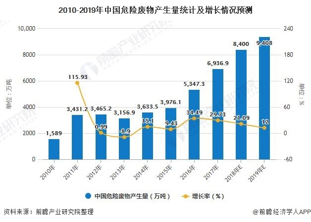 我國工業(yè)化進(jìn)程加速,危險廢物的排放也日益增多。2010年我國危險固體廢物產(chǎn)生量已達(dá)到1589萬噸,為2000年的1.91倍。根據(jù)2018年中國統(tǒng)計年鑒數(shù)據(jù)顯示,2017年,全國危險廢物產(chǎn)生量為6936.9萬噸,較2016年增長29.73%。2016-2017年我國危險廢棄物產(chǎn)生量均保持較高的增長,據(jù)前瞻初步估計,2018我國危險廢棄物產(chǎn)生量在8400萬噸左右。