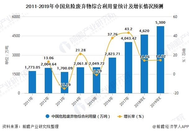 2019-2020年,清廢行動逐漸向全國擴(kuò)散,有利于推動危廢處理行業(yè)市場擴(kuò)大,前瞻初步估計我國危險廢棄物綜合利用量為5300萬噸,預(yù)計2020年,我國危廢綜合利用量將呈現(xiàn)快速增長。