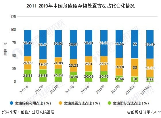 隨著環(huán)保行業(yè)的發(fā)展,我國危險廢棄物處置中綜合利用比重越來越高,由2011年的50.47%溫和上升到2017年的54.16%,前瞻初步估計2019年,危廢綜合利用占比將達(dá)到55.49%,深度資源化正成為危廢行業(yè)的發(fā)展方向;2015以來危廢貯存占比逐年下降,初步估計2019年危廢貯存量占比為8.88%;危廢處置占比也呈現(xiàn)增長態(tài)勢,初步估計2019年危廢處置方法占比達(dá)到35.63%。