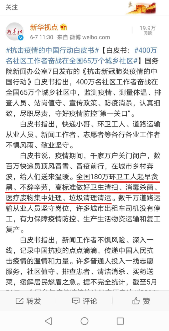 國(guó)務(wù)院新聞辦公室7日發(fā)布《抗擊新冠肺炎疫情的中國(guó)行動(dòng)》白皮書。白皮書充分肯定了疫情期間180萬(wàn)環(huán)衛(wèi)工人所付出的努力。