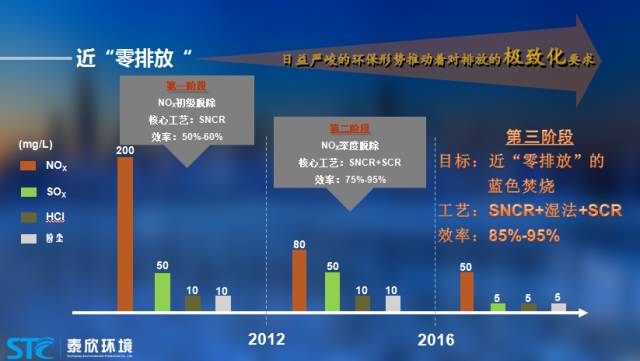 第一個階段,在2012年之前,我們比較傳統(tǒng)的處理工藝是SNCR,NOX初級脫除效率是50%-60%;第二個階段,2012年以后,由于引用了SCR,排放標準得到進一步的降低,NOX深度脫除效率達75%-95%;第三個階段,到2016年,國家環(huán)保管理總體收緊,煙氣的排放標準越來越嚴,要求近“零排放”的藍色焚燒。對于我們來說,就需要將工藝做進一步改進。我們判斷,低溫的SCR處理和濕法處理工藝的價值會凸顯出來。