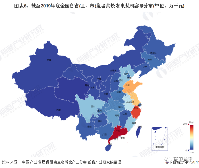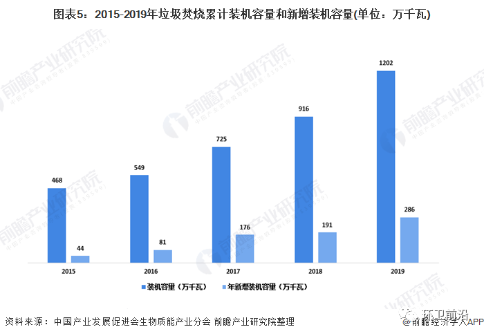 截至2019年底,全國30個省(區(qū)、市)垃圾焚燒發(fā)電累計裝機容量為1202萬千瓦,較2018年增長31%,2019年新增發(fā)電裝機容量286萬千瓦。