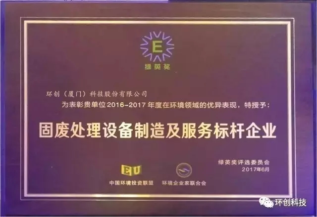 2017年6月8日下午,第十屆中國(guó)環(huán)境產(chǎn)業(yè)大會(huì)在北京召開,環(huán)創(chuàng)科技憑借在固廢處理設(shè)備制造行業(yè)成熟先進(jìn)的技術(shù),及優(yōu)秀的產(chǎn)品質(zhì)量和服務(wù)質(zhì)量,榮獲大會(huì)隆重頒發(fā)“綠英獎(jiǎng)”暨“固廢處理設(shè)備制造及服務(wù)標(biāo)桿企業(yè)”榮譽(yù)稱號(hào)。