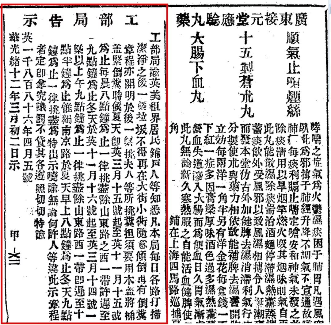 1886年4月30日《申報》刊登租界當局關(guān)于定時收集垃圾和糞便的通告