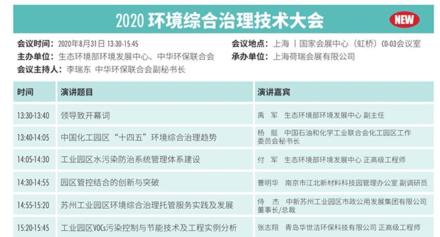 由生態(tài)環(huán)境部環(huán)境發(fā)展中心聯(lián)合中華環(huán)保聯(lián)合會將于2020年8月31日在上海國家會展中心組織召開“2020環(huán)境綜合治理技術大會”及系列活動,聚焦化工工業(yè)園區(qū)第三方綜合治理,關注工業(yè)企業(yè)廢水、廢氣、固體廢棄物處理處置問題和管理能力提升,探索開展環(huán)境綜合治理托管、環(huán)保管家、環(huán)境顧問等服務模式。