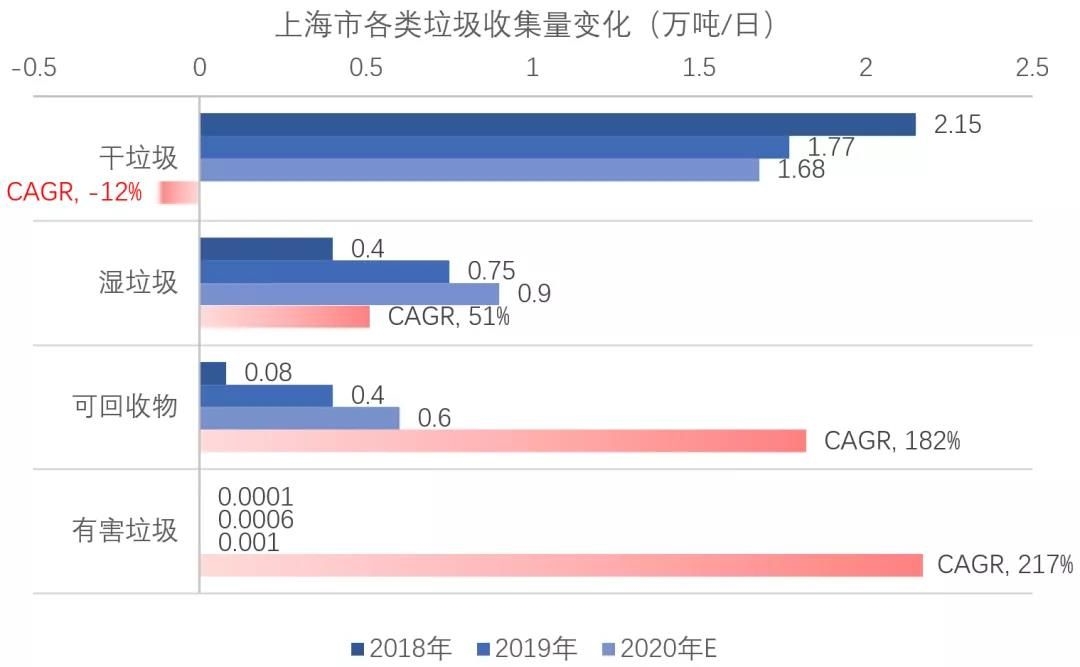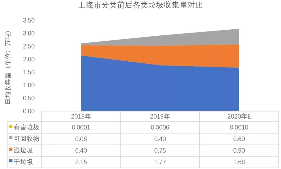 垃圾分類的效果在以上海為代表的部分城市已經(jīng)開始有所體現(xiàn),可收集垃圾結(jié)構(gòu)發(fā)生明顯改變,濕垃圾(廚余垃圾)占比明顯提升并逐步穩(wěn)定:上海市在2019年7月1日正式實施強制分類之后,取得了顯著的成效,2019年1.3萬余個居住區(qū)(村)垃圾分類達標(biāo)率由2018年年底的15%提高到90%,單位達標(biāo)率總體為87%。具體到各類垃圾來看,2019年,上海日均干垃圾處置量1.77萬噸,濕垃圾分出量0.75萬噸,可回收物0.40萬噸,有害垃圾分出量0.6噸,同比分別減少17.5%,增加88.8%、431.8%和504.1%。