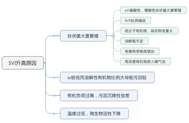 SVI值與污泥負(fù)荷有關(guān),污泥負(fù)荷過高或過低,活性污泥的代謝性能都會(huì)變差,SVI值也會(huì)變很高,存在出現(xiàn)污泥膨脹的可能。