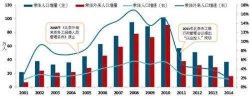 從2010年開始,為應(yīng)對外來人口過快增長,北京出臺(tái)一系列人口調(diào)控組合拳,從此之后,北京外來人口增速一直呈現(xiàn)下降態(tài)勢。后來,隨著北京城市規(guī)劃中對勞動(dòng)密集型產(chǎn)業(yè)的壓縮和外遷,廢品回收產(chǎn)業(yè)被列入被禁止建設(shè)的行業(yè),北京市再生資源回收遇到了前所未有的寒冬,北京五環(huán)到六環(huán)之間的廢品分類和交易市場在數(shù)月期間消失。