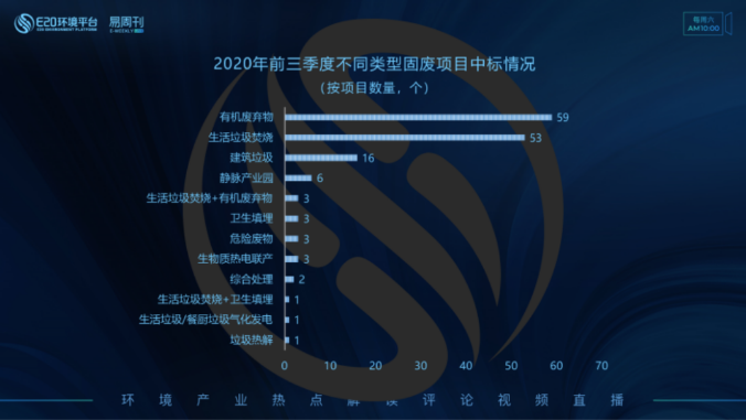 將固廢項(xiàng)目按照項(xiàng)目類型細(xì)分,其中:有機(jī)廢棄物處置項(xiàng)目59個(gè),生活垃圾焚燒項(xiàng)目53個(gè),建筑垃圾處置項(xiàng)目16個(gè),靜脈產(chǎn)業(yè)園建設(shè)與運(yùn)營(yíng)項(xiàng)目6個(gè),生活垃圾焚燒與有機(jī)廢棄物協(xié)同、衛(wèi)生填埋、危險(xiǎn)廢物處置、生物質(zhì)熱電聯(lián)產(chǎn)等項(xiàng)目各3個(gè),生活垃圾綜合處理項(xiàng)目2個(gè),生活垃圾焚燒與衛(wèi)生填埋協(xié)同、垃圾熱解、生活/餐廚垃圾氣化發(fā)電項(xiàng)目各1個(gè)。