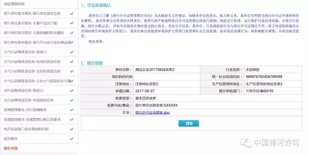 排污單位填寫完所有信息后,點(diǎn)擊“提交”按鈕,即完成排污許可證變更申報(bào)。系統(tǒng)會(huì)對(duì)變更內(nèi)容進(jìn)行標(biāo)識(shí),綠色文字為排污單位變更過(guò)程中新增內(nèi)容,紅色文字為排污單位變更過(guò)程中修改內(nèi)容。