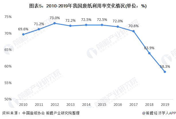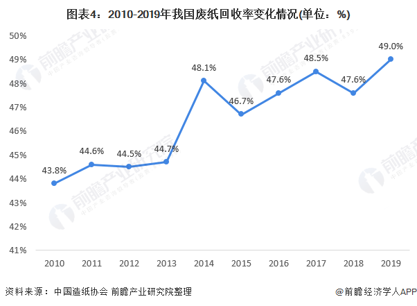 此前,國內(nèi)廢紙的回收率一直沒有改善,而且回收的廢紙也大量被技術(shù)落后的小企業(yè)加工成紙板、衛(wèi)生紙等低檔次產(chǎn)品,沒有發(fā)揮廢紙的資源價(jià)值,還帶來嚴(yán)重的二次污染。產(chǎn)業(yè)化水平低的根源在于廢紙?jiān)偕a(chǎn)業(yè)扶持政策缺乏力度,但產(chǎn)業(yè)基礎(chǔ)差也是一個(gè)重要制約因素。但近年來,隨著國民環(huán)保意識的調(diào)高和垃圾分類的推廣,我國廢紙回收率波動(dòng)上升,2019年,我國廢紙回收率達(dá)到49.0%,實(shí)現(xiàn)10年間廢紙回收率的新高。
