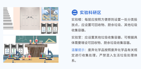 學(xué)校場景的指引按師生的日常活動,分區(qū)進(jìn)行指導(dǎo),貼合師生生活實際。其中對實驗科研區(qū)可能會產(chǎn)生廢棄化學(xué)品,指引中做出了相關(guān)溫馨提示,“廢棄化學(xué)品按照廢棄化學(xué)品有關(guān)規(guī)定進(jìn)行收集處理,嚴(yán)禁混入生活垃圾處理體系”。