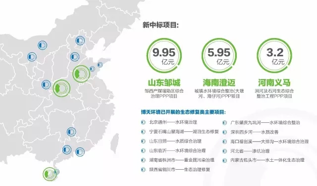近日,博天環(huán)境集團(603603.SH)通過聯(lián)合體合作方式分別贏取了位于山東省鄒城市、河南省義馬市和海南省澄邁縣的三個生態(tài)修復(fù)類項目。其中山東省鄒城市鄒西產(chǎn)煤塌陷區(qū)綜合治理PPP項目,投資概算約9.95億元;河南省義馬市澗河及石河生態(tài)綜合整治工程(PPP),項目總投資約3.2億元;海南省澄邁縣城鎮(zhèn)水環(huán)境綜合整治(大塘河、海仔河)PPP項目,估算總投資5.95億元。