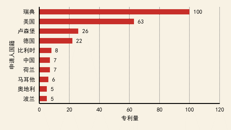 核心專(zhuān)利分布方面,排名前三的是瑞典、美國(guó)和盧森堡。