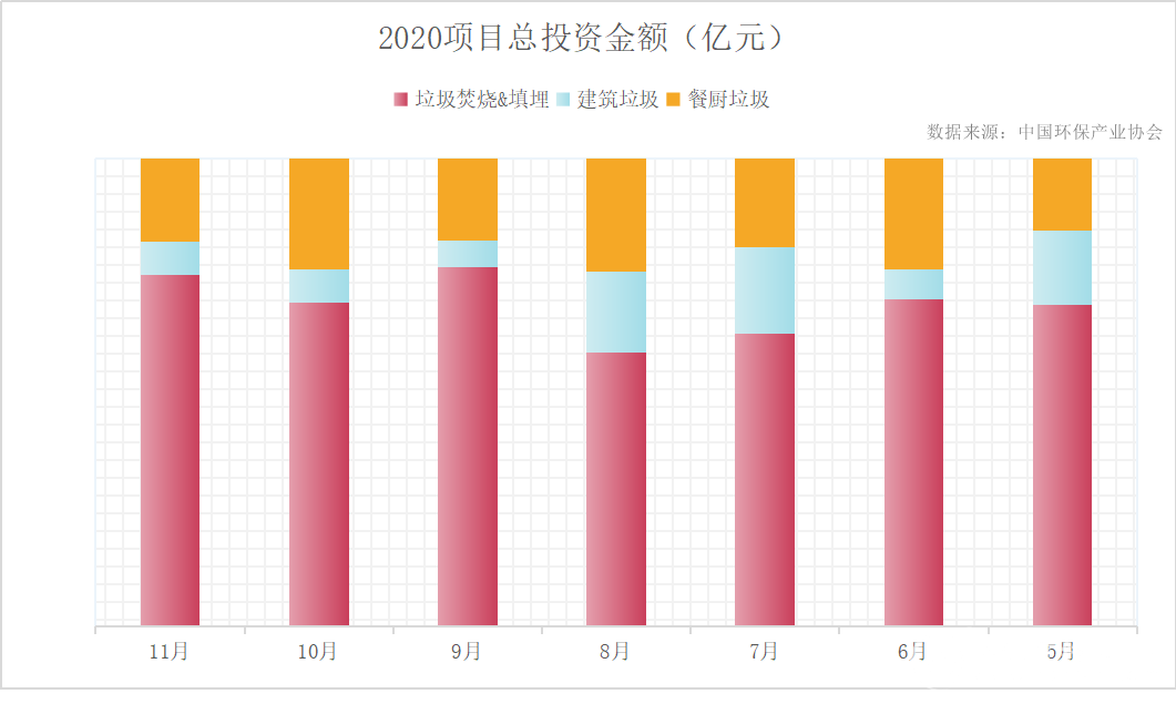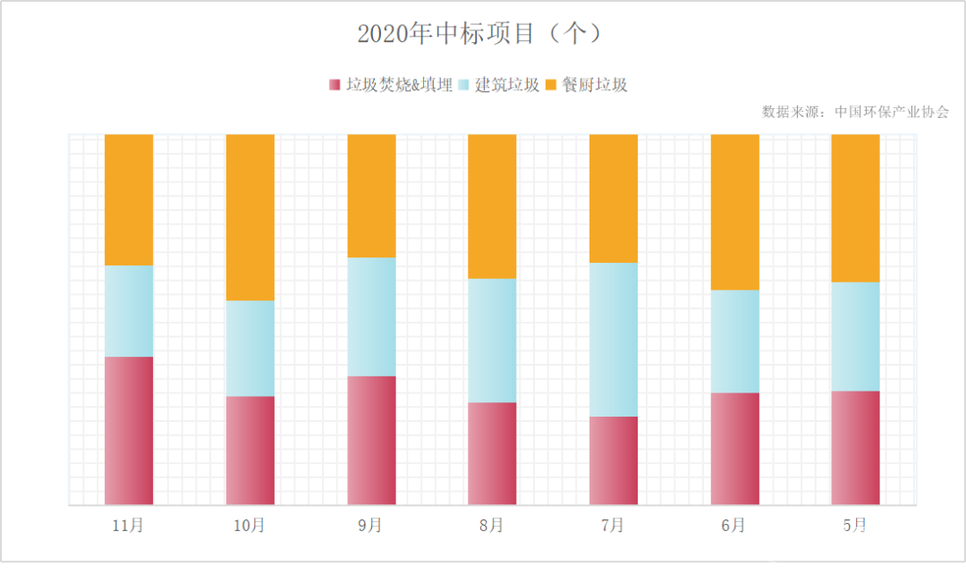 應(yīng)開展信息發(fā)布工作的環(huán)境保護(hù)重點(diǎn)城市和環(huán)境保護(hù)模范城市均已按照規(guī)定發(fā)布信息,統(tǒng)計(jì)數(shù)據(jù)差異源于自愿開展信息發(fā)布工作的城市數(shù)量。再來看2020年前11個(gè)月的細(xì)分領(lǐng)域數(shù)據(jù)——2020年前11個(gè)月,全國垃圾焚燒中標(biāo)項(xiàng)目共計(jì)311項(xiàng),總投資金額共計(jì)655.15億元;餐廚垃圾處理處置中標(biāo)項(xiàng)目共計(jì)361項(xiàng),總投資金額194.6億元;2020年5月到11月,全國建筑垃圾處理處置中標(biāo)項(xiàng)目共計(jì)213項(xiàng),總投資金額61.85億元。從中標(biāo)項(xiàng)目數(shù)量來看,垃圾焚燒和填埋、建筑垃圾、餐廚垃圾處理處置項(xiàng)目各有千秋,但是從總投資金額,以及單個(gè)項(xiàng)目平均投資金額來看,垃圾焚燒&填埋顯然遠(yuǎn)超后兩者。相較之下,建筑垃圾處理處置項(xiàng)目波動(dòng)較大,餐廚垃圾處理處置項(xiàng)目中標(biāo)情況則較為平穩(wěn)。十九屆五中全會(huì)通過的《中共中央關(guān)于制定國民經(jīng)濟(jì)和社會(huì)發(fā)展第十四個(gè)五年規(guī)劃和二〇三五年遠(yuǎn)景目標(biāo)的建議》明確指出,到2035年,廣泛形成綠色生產(chǎn)生活方式,碳排放達(dá)峰后穩(wěn)中有降,生態(tài)環(huán)境根本好轉(zhuǎn),美麗中國建設(shè)目標(biāo)基本實(shí)現(xiàn)。