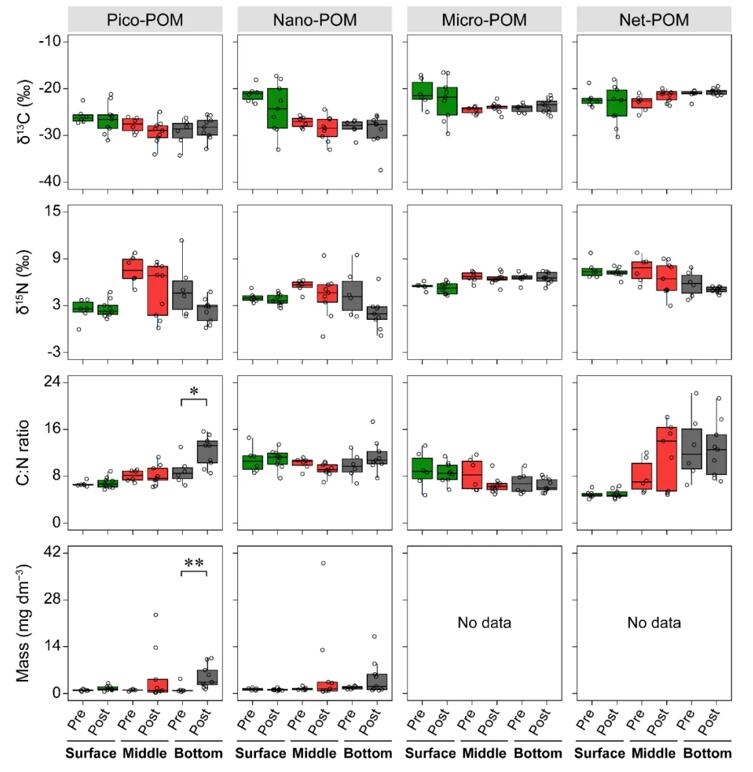 圖2 臺風前后顆粒有機物碳氮同位素、化學計量和質量的變化