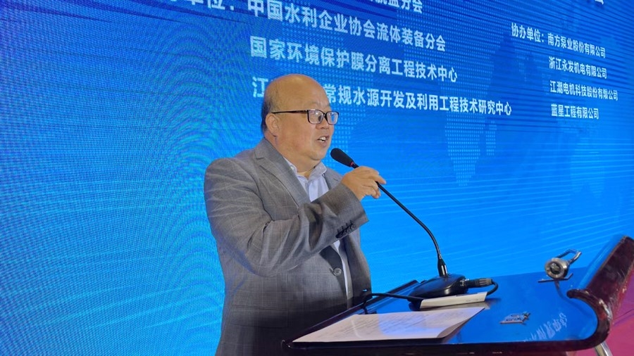 中國水利企業(yè)協(xié)會脫鹽分會會長郭有智,延安市寶塔區(qū)委常委、區(qū)政府常務(wù)副區(qū)長劉宇梁,中國水利企業(yè)協(xié)會流體裝備分會會長牟介剛,脫鹽分會副會長—南方泵業(yè)總裁沈鳳祥、杭州水處理技術(shù)研究開發(fā)中心總工程師楊波、自然資源部天津海水淡化與綜合利用研究所張旖、超純環(huán)保總經(jīng)理王軍、東晟環(huán)保副總經(jīng)理汪大慶,脫鹽分會秘書長—天元恒業(yè)水總經(jīng)理李明,會議協(xié)辦單位—南方泵業(yè)總經(jīng)理沈勤偉、浙江永發(fā)機電董事長高樹彪、江潮電機副總裁陳建躍、藍(lán)星工程總工吉春紅等領(lǐng)導(dǎo)嘉賓應(yīng)邀出席了本次會議。