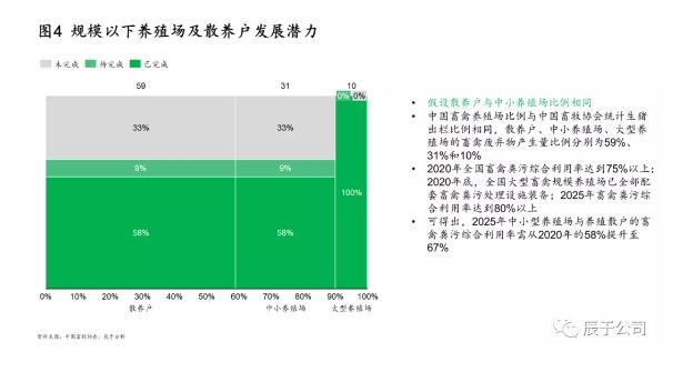 實(shí)現(xiàn)以上提到的目標(biāo)(到2025年畜禽廢棄物綜合利用率達(dá)到80%),我們估算中小型養(yǎng)殖場與養(yǎng)殖散戶的畜禽糞污綜合利用率需從當(dāng)前的58%提升至67%(如圖4,假設(shè)中國畜禽養(yǎng)殖場比例與中國畜牧協(xié)會統(tǒng)計(jì)生豬出欄比例相同[1]),中小型養(yǎng)殖場與養(yǎng)殖散戶將成為未來發(fā)展重點(diǎn)。