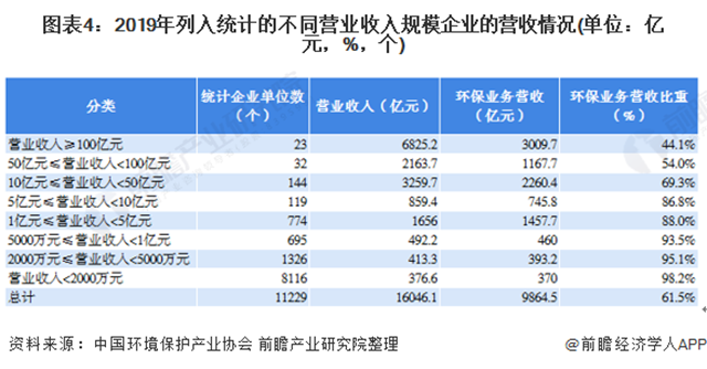 營業(yè)收入規(guī)模越小的企業(yè),環(huán)保業(yè)務(wù)營業(yè)收入在總營業(yè)收入中所占比重越高,其環(huán)保專業(yè)化程度也越高,營業(yè)收入超過l00億元的企業(yè),環(huán)保業(yè)務(wù)營業(yè)收入平均占比為44.l%,營業(yè)收入小于2000萬元的企業(yè),其環(huán)保業(yè)務(wù)營業(yè)收入平均占比達(dá)98.2%。