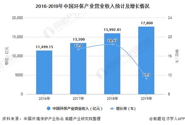 盡管受到2018年產(chǎn)業(yè)發(fā)展流動性危機(jī)余波及中美貿(mào)易摩擦的影響,2019年一些環(huán)保企業(yè)依然面臨著經(jīng)營危機(jī),但總體來看,2019年環(huán)保產(chǎn)業(yè)整體發(fā)展態(tài)勢趨好,持續(xù)保持了較快發(fā)展。據(jù)中國環(huán)境保護(hù)產(chǎn)業(yè)協(xié)會測算數(shù)據(jù),2019年全國環(huán)保產(chǎn)業(yè)營業(yè)收入約17800億元,較2018年增長約11.3%。