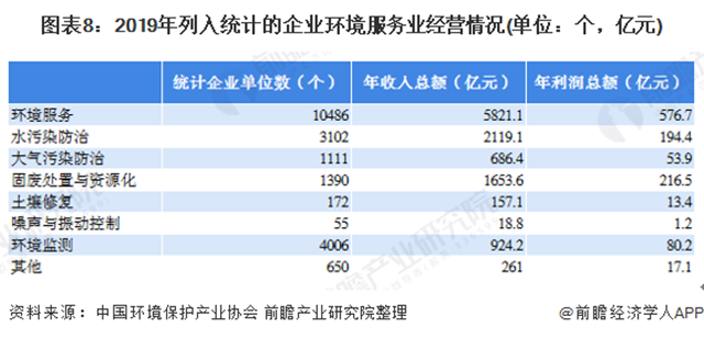 據(jù)環(huán)境保護(hù)產(chǎn)業(yè)協(xié)會數(shù)據(jù),2019年我國列入統(tǒng)計的環(huán)境服務(wù)企業(yè)共10486個,年收入總額為5281.1億元,年利潤總額為576.7億元。