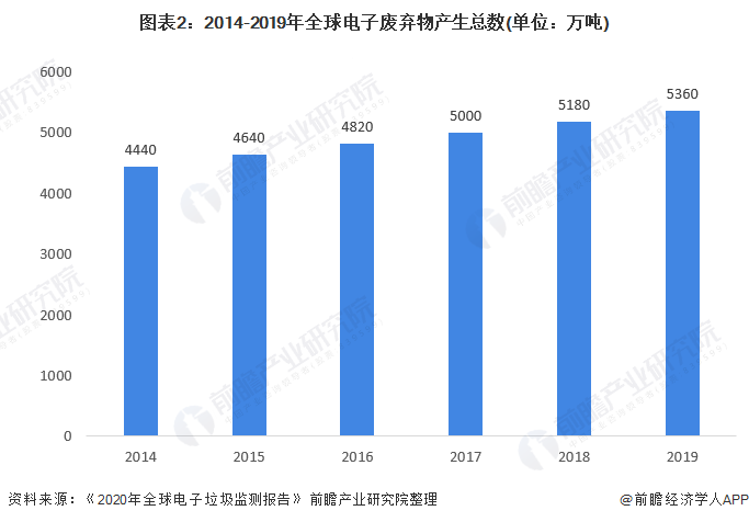 《2020年全球電子垃圾監(jiān)測(cè)報(bào)告》顯示,自2014年以來(lái),電子廢棄物的總產(chǎn)生量逐年增長(zhǎng),至2019年增加了920萬(wàn)噸,每年增長(zhǎng)近200萬(wàn)噸,2019年產(chǎn)生了約5360萬(wàn)噸電子廢棄物(不包括光伏電池板)。