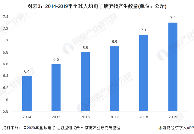 從人均電子廢棄物產(chǎn)生量上看,2014年以來(lái),全球人均電子廢棄物產(chǎn)生量逐年增長(zhǎng),2014年,全球人均電子廢棄物產(chǎn)生量為6.4公斤,至2019年達(dá)7.3公斤,較2014年增長(zhǎng)0.9公斤。