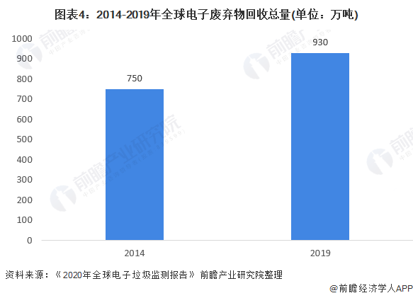 2019年,正式記錄在案的收集和回收量為930萬(wàn)噸,占所產(chǎn)生電子廢棄物的17.4%。自2014年以來(lái),電子廢棄物回收量增長(zhǎng)180萬(wàn)噸,每年增加近40萬(wàn)噸。然而,電子廢棄物的總產(chǎn)生量增加了920萬(wàn)噸,每年增長(zhǎng)近200萬(wàn)噸。這說(shuō)明回收活動(dòng)跟不上電子廢棄物的增長(zhǎng)速度。