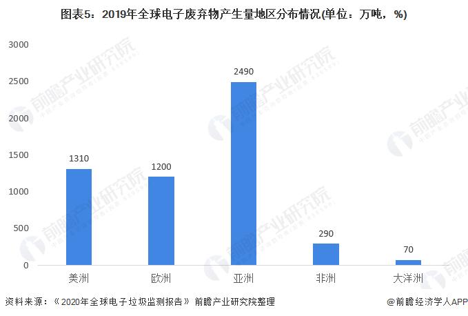 從區(qū)域分布上看,2019年,大部分電子廢棄物產(chǎn)生于亞洲,2019年亞洲電子廢棄物產(chǎn)生量達(dá)2490萬(wàn)噸;其次為美洲,電子廢棄物產(chǎn)生量達(dá)1310萬(wàn)噸。