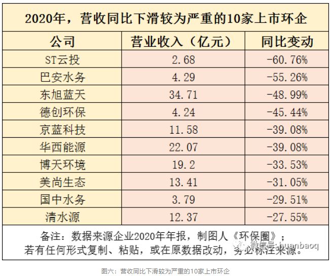 相比上述企業(yè)的出彩表現(xiàn),接下來圖六表格中的ST云投、巴安水務(wù)、東旭藍(lán)天、華西能源、國(guó)中水務(wù)、清水源等10家上市環(huán)企的表現(xiàn)則不盡如意,2020年?duì)I業(yè)收入下滑較為嚴(yán)重,降幅最大的前三分別是ST云投、巴安水務(wù)、東旭藍(lán)天。