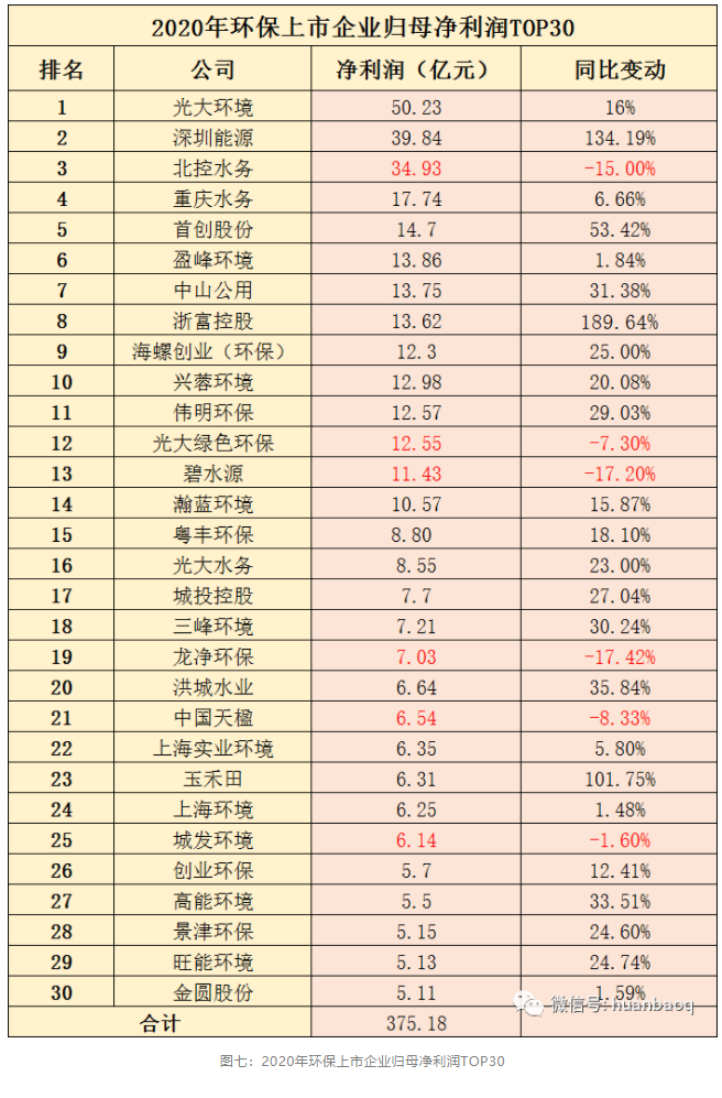 不過,TOP30強(qiáng)中,像業(yè)內(nèi)比較熟悉明星上市環(huán)企,北控水務(wù)、光大綠色環(huán)保、碧水源、龍凈環(huán)保、中國(guó)天楹、城發(fā)環(huán)境等,2020年歸母凈利潤(rùn)都遭到不同程度下滑。