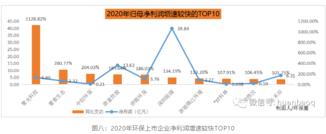 在外界宏觀條件不利、疫情生死攸關(guān)的2020年,仍有一些上市環(huán)企脫穎出來,從凈利潤(rùn)增速來看,2020年增速較快TOP10上市環(huán)企非常有看點(diǎn)(如圖八所示)。