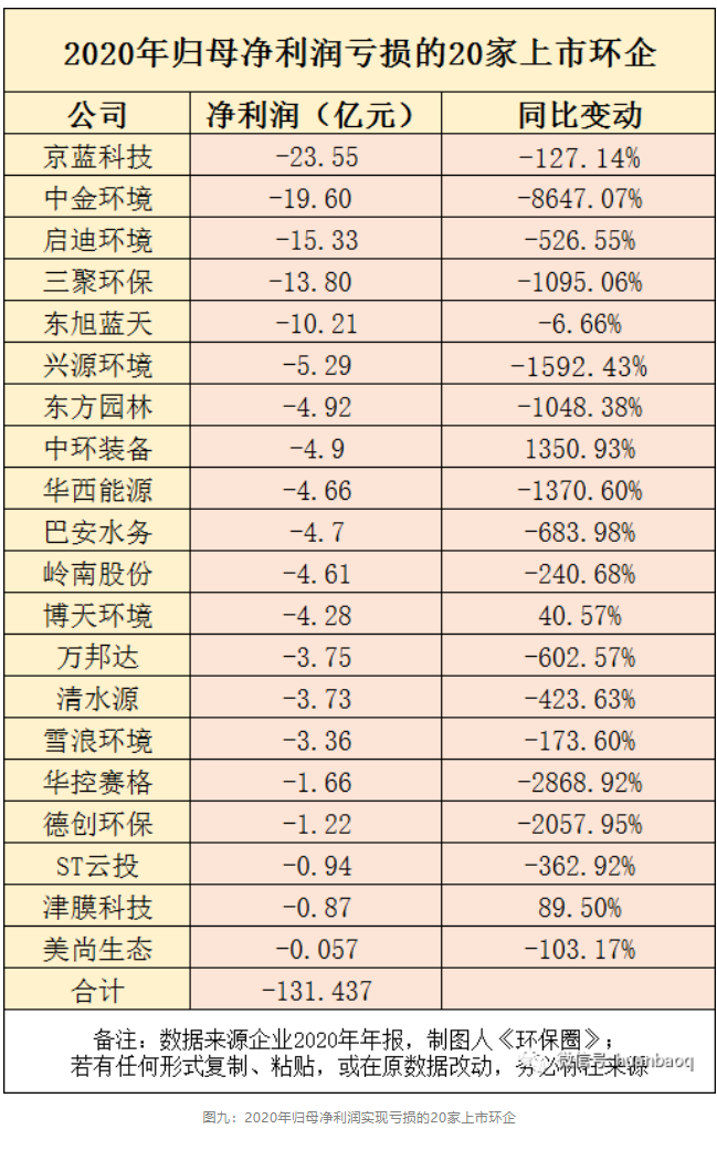 如果要在這20家虧損企業(yè)中,找到2020上市環(huán)企虧損幅度最大的“十大虧損王”,如圖十所示中金環(huán)境、德創(chuàng)環(huán)保、華控賽格、興源環(huán)境、三聚環(huán)保、東方園林、巴安水務(wù)、萬邦達(dá)、啟迪環(huán)境、清水源都“榜上有名”。