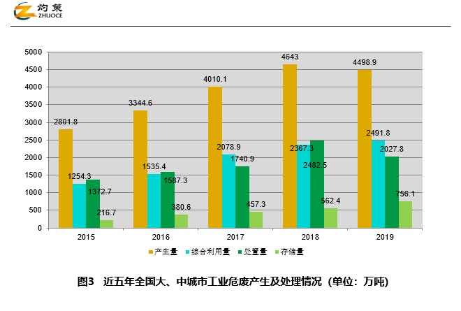 2014-2018年,我國196個(gè)大、中城市工業(yè)危廢產(chǎn)量持續(xù)上升,綜合利用量和處置量增幅不大;2019年產(chǎn)生量有所回落,為4498.9萬噸,綜合利用量為2491.8萬噸,處置量2027.8萬噸,貯存量756.1萬噸,歷年貯存量持續(xù)上升。