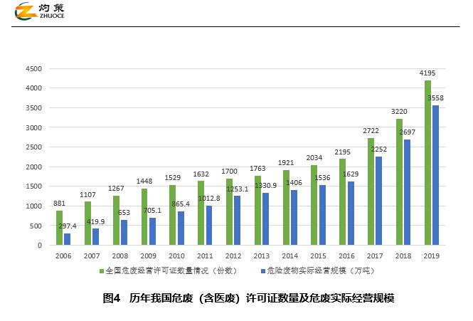 我國危廢處理行業(yè)的經(jīng)營規(guī)模在逐年增長,據(jù)《年報(bào)》,截至2019年底,全國危險(xiǎn)廢物許可證持證單位共4195個(gè),同比增長30.3%。其核準(zhǔn)收集和利用處置能力達(dá)到12896萬噸/年(含單獨(dú)收集能力1826萬噸/年);2019年度實(shí)際收集和利用處置量為3558萬噸(含單獨(dú)收集81萬噸)。與2006年相比,2019年危險(xiǎn)廢物持證單位核準(zhǔn)收集和利用處置能力、危險(xiǎn)廢物實(shí)際收集和利用處置量分別增長1709%和1098%。