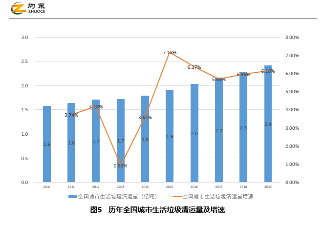 據(jù)統(tǒng)計(jì),全國城市生活垃圾清運(yùn)量持續(xù)增長,2019年達(dá)2.4億噸,按近四年平均6%左右的增速計(jì)算,預(yù)測2020年達(dá)2.6億噸,2025年達(dá)3.4億噸。