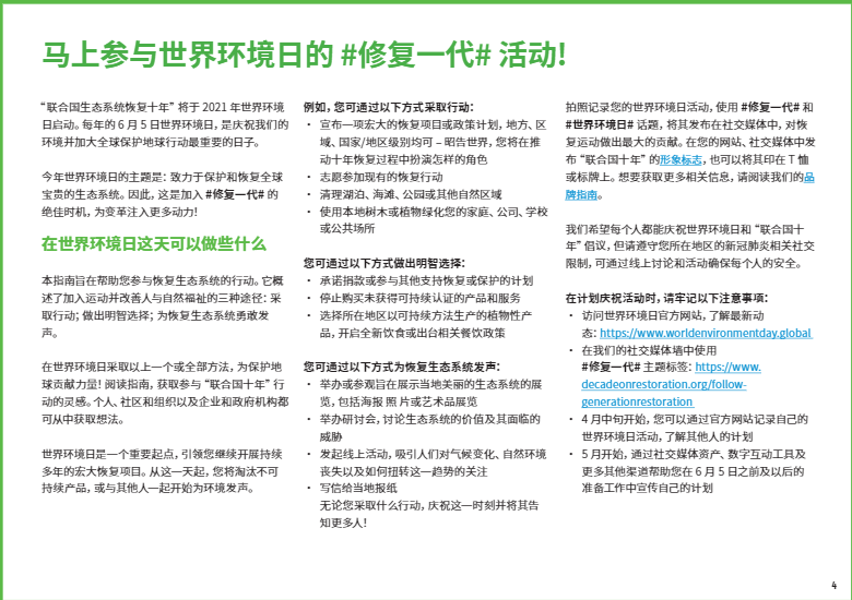 在本文中,我們將重點(diǎn)介紹八個(gè)關(guān)鍵的生態(tài)系統(tǒng)類型,以及如何開(kāi)展修復(fù)工作使它們恢復(fù)活力。如果你有志于加入#修復(fù)一代,#RestorationGeneration,想深入了解改善本地生態(tài)系統(tǒng)的方法,歡迎大家下載閱讀由”聯(lián)合國(guó)十年”倡議發(fā)布的《生態(tài)系統(tǒng)修復(fù)手冊(cè)》,一本有關(guān)治愈地球的實(shí)用指南??