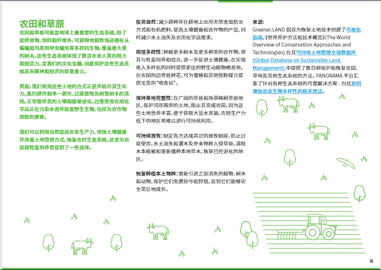 對(duì)土地的過(guò)度墾殖以及不合理的耕作利用、水土流失、過(guò)量使用化肥和農(nóng)藥正在耗盡農(nóng)田中土壤的活力?;謴?fù)農(nóng)田的方法包括減少耕種,更多地使用天然肥料和病蟲(chóng)害防治方法以及種植包括樹(shù)木在內(nèi)的多種農(nóng)作物。這些行動(dòng)有助于重建土壤中的碳儲(chǔ)量,使其更加肥沃,確保各國(guó)在不占用更多耕地面積的情況下養(yǎng)活不斷增長(zhǎng)的人口。農(nóng)田的恢復(fù)還為野生動(dòng)植物創(chuàng)造了棲息地。