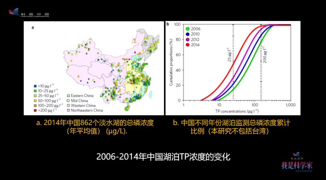 這個(gè)中國地圖表明我們有很多的污染物沒有處理好,就會(huì)進(jìn)入到湖泊里面。這個(gè)地方講的是磷會(huì)到我們的湖泊里。如果沒有處理好,氮也會(huì)到湖泊里去,也會(huì)到各種水體里去。