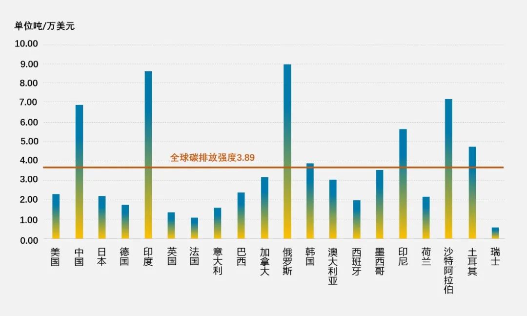 碳排放總量在2008年首度超過美國,2019年已接近美國的2倍,占全球總碳排放的27.2%,超過美國和歐盟的總和。人均碳排放量已超過歐盟,排名全球第二。如延續(xù)原有發(fā)展模式,將在短期內超過美國。2019年,碳排放強度為6.88噸/萬美元,高出全球平均43%。