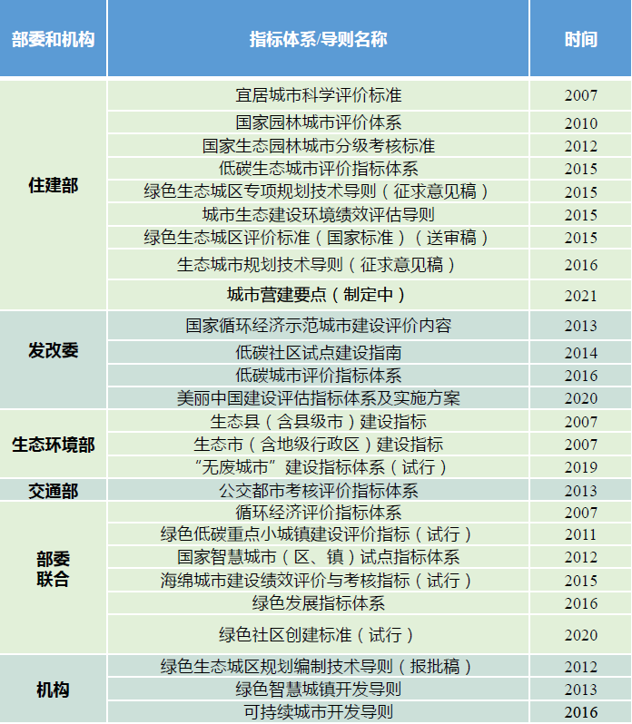2007年以來,國內相關部委和機構已經制定和發(fā)布多項相關標準、評價體系、技術導則、建設指南、指標體系等,其中,部分尚在征求意見或試行過程中。