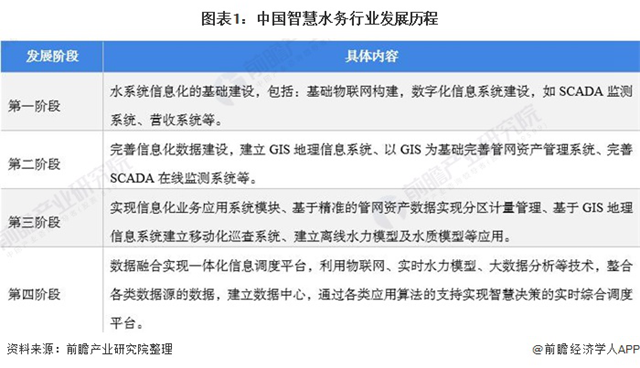智慧水務(wù)是指利用物聯(lián)網(wǎng)、智能傳感、云計(jì)算、大數(shù)據(jù)等技術(shù)對(duì)供水、排水、節(jié)水、污水處理、防洪等水務(wù)環(huán)節(jié)進(jìn)行智慧化管理。我國(guó)智慧水務(wù)經(jīng)歷了信息化的基礎(chǔ)建設(shè)、完善信息化數(shù)據(jù)和應(yīng)用模塊等建設(shè),行業(yè)正處于第四階段——數(shù)據(jù)融合實(shí)現(xiàn)一體化信息調(diào)度平臺(tái)階段。