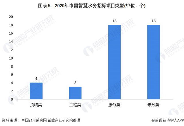 從項(xiàng)目類型來看,我國(guó)智慧水務(wù)項(xiàng)目采購內(nèi)容包括貨物類、工程類和服務(wù)類。2020年,我國(guó)智慧水務(wù)招標(biāo)項(xiàng)目中貨物類項(xiàng)目4個(gè),工程類項(xiàng)目3個(gè),服務(wù)類項(xiàng)18個(gè),未分類項(xiàng)目18個(gè)。