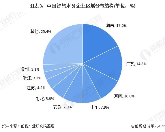 截至2021年6月9日,我國(guó)智慧水務(wù)行業(yè)企業(yè)(經(jīng)營(yíng)范圍包含智慧水務(wù)的存續(xù)在業(yè)企業(yè))在湖南省的占比最大為17.6%,其次是廣東省,占比為14.8%。