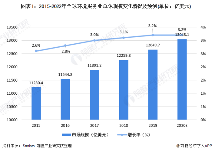 隨著環(huán)境保護(hù)和可持續(xù)發(fā)展理念的廣泛普及,世界環(huán)境服務(wù)業(yè)市場呈現(xiàn)迅速發(fā)展的勢頭,世界各國,特別是發(fā)達(dá)國家紛紛出臺(tái)相關(guān)政策并加大資金投入,加大對環(huán)保市場的扶持力度。2019年全球環(huán)境服務(wù)業(yè)市場規(guī)模達(dá)到12649.70億美元,同比增長3.20%,預(yù)估全球環(huán)境服務(wù)市場繼續(xù)保持穩(wěn)步發(fā)展態(tài)勢,2020年全球總規(guī)模達(dá)到13048.1億美元。