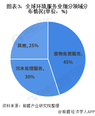 環(huán)境服務(wù)業(yè)各分項(xiàng)目發(fā)展很不平衡,廢物處置服務(wù)和污水處理服務(wù)占環(huán)境服務(wù)市場的主要份額。目前,這兩個(gè)項(xiàng)目產(chǎn)值占全球環(huán)境服務(wù)市場的75%,其中廢物處置服務(wù)占45%,污水處理服務(wù)占30%。