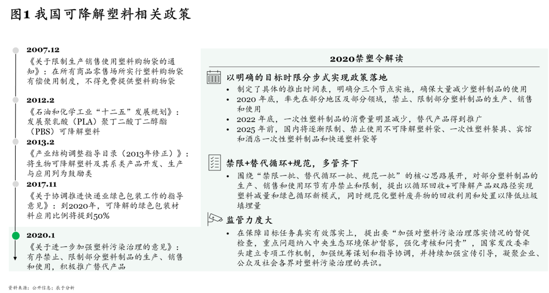 我國可降解塑料市場早在2012年就已經(jīng)起步,但由于早期市場需求低迷,原料成本過高、產(chǎn)能有限,行業(yè)整體發(fā)展緩慢,進(jìn)入市場較早的一些企業(yè)甚至因訂單長期不足而被迫轉(zhuǎn)型。直到2020年1月,《關(guān)于進(jìn)一步加強(qiáng)塑料污染治理的意見》(以下簡稱“禁塑令”)出臺,要求有序禁止、限制部分塑料制品的生產(chǎn)、銷售和使用,積極推廣替代產(chǎn)品,正式從“限塑”轉(zhuǎn)為“禁塑”(見圖1)。