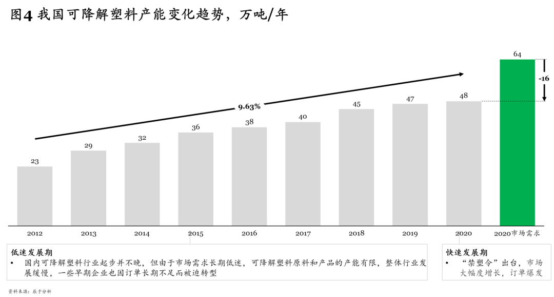 由于早前市場長期低迷,國內(nèi)可降解塑料的產(chǎn)能增速一直較慢,據(jù)統(tǒng)計, 2012~2020年間,這一數(shù)字的年復(fù)合增長率為9.63%,到2020年達(dá)到48萬噸/年,同年的市場需求則為64萬噸/年,產(chǎn)能缺口較大(見圖4)。