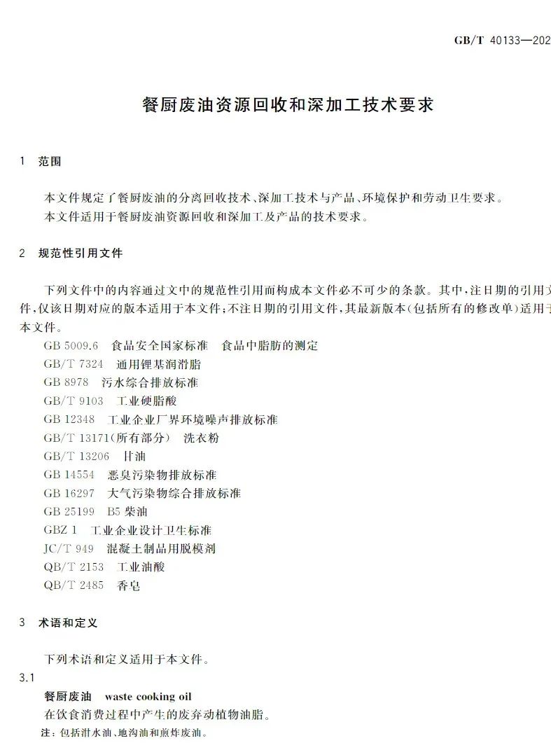 近日,由北京工商大學(xué)、深圳市朗坤環(huán)境集團(tuán)股份有限公司等八家單位共同起草的GB/T 40133-2021《餐廚廢油資源回收和深加工技術(shù)要求》,于2021年5月21日經(jīng)國家市場監(jiān)督管理總局(國家標(biāo)準(zhǔn)化管理委員會(huì))批準(zhǔn)發(fā)布,自2021年12月1日起實(shí)施。朗坤環(huán)境集團(tuán)副總裁楊友強(qiáng)博士、生物柴油技術(shù)總監(jiān)蘇躍華為該國標(biāo)文件主要起草人。