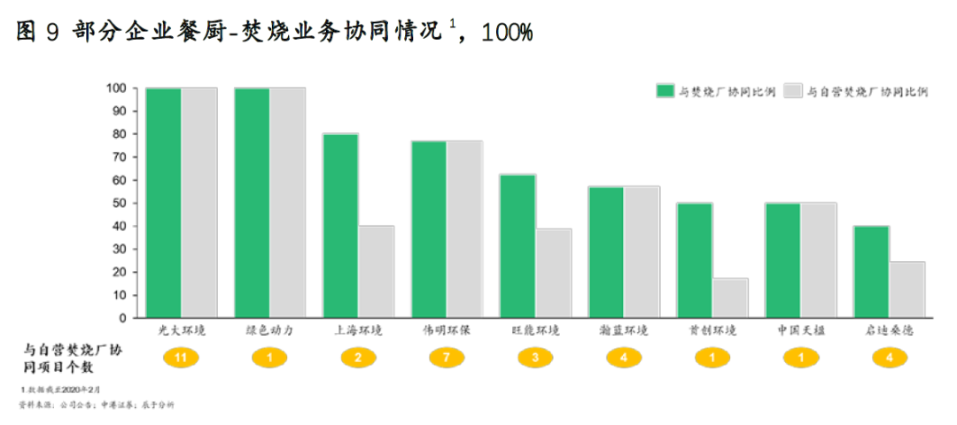 在垃圾分類全面推行的大背景下,這些大型固廢企業(yè)正利用協(xié)同優(yōu)勢降維打擊(見圖9)。一方面,垃圾焚燒主業(yè)帶給這些企業(yè)資金和政府資源雙重優(yōu)勢;另一方面,協(xié)同處置帶來降本增效,可以幫助這些企業(yè)降低財務(wù)壓力:在收入端,協(xié)同優(yōu)勢在于餐廚沼渣余電上網(wǎng);而在成本端,除可節(jié)約土建、人工等成本外,干濕垃圾處置的發(fā)電設(shè)備、除臭系統(tǒng)、滲濾液處理系統(tǒng)、蒸汽供熱系統(tǒng)等也可共用,從而降低折舊攤銷成本。